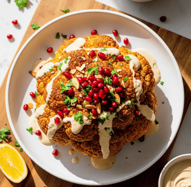 A stunning plant-based centerpiece that’s crisp on the outside, tender inside, and bursting with Middle Eastern flavor. The creamy tahini drizzle and juicy pomegranate seeds add richness and brightness in every bite. Simple, elegant, and perfect for any table!