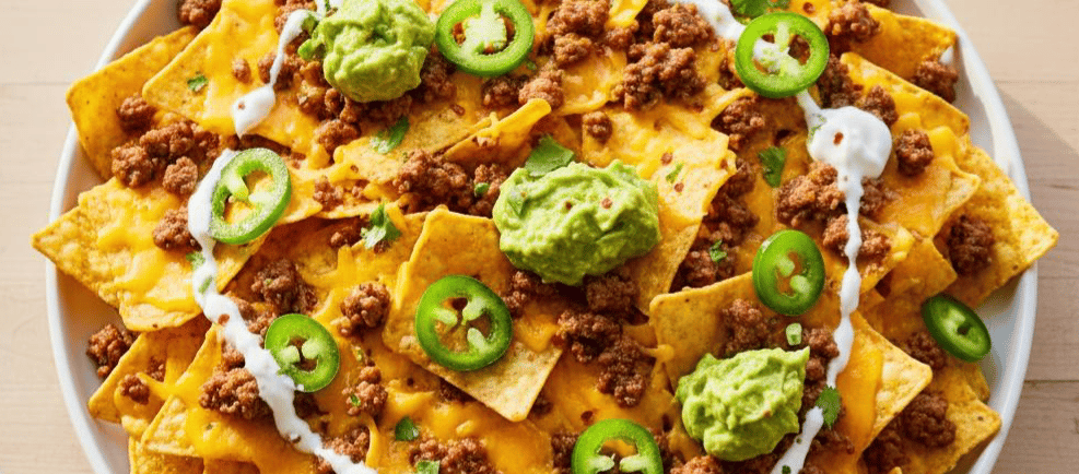 Heat olive oil in a skillet over medium heat. Add ground beef and cook until browned, about 5–7 minutes. Drain excess fat, then stir in taco seasoning and a splash of water. Simmer for 2 minutes, then remove from heat.Assemble the Nachos: